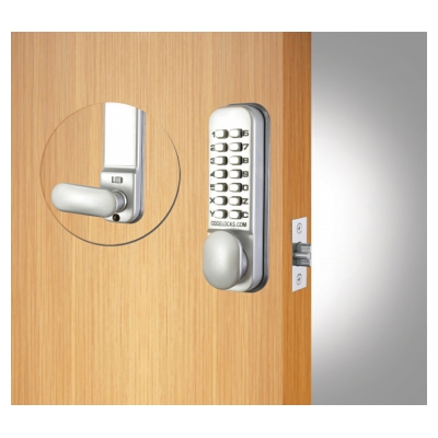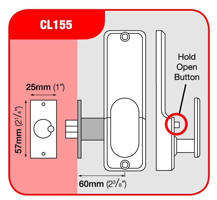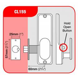 Functionally the same as the CL150 with the addition of a slide button which can be used to hold open the latchbolt for free entry without operating the code (when the lock is not required to be operational).