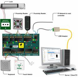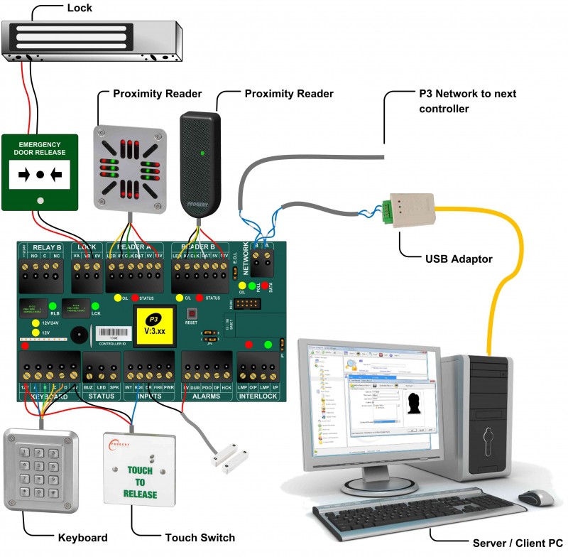 The connector feature of the Doors software means that any or all of the methods can be used together to suit different parts of the system. The network between controllers requires a simple 2 wire RS 485 data cable.