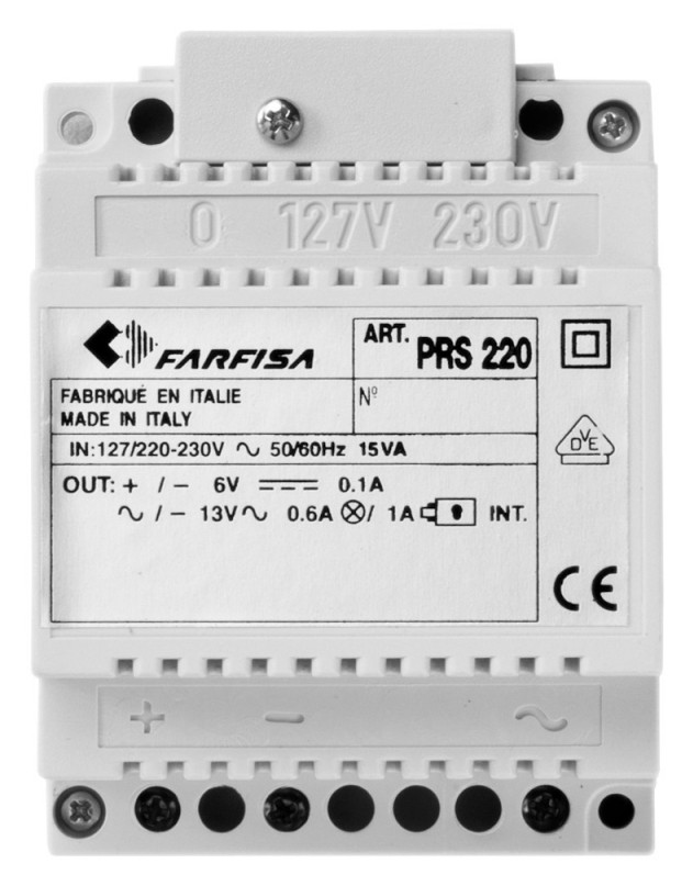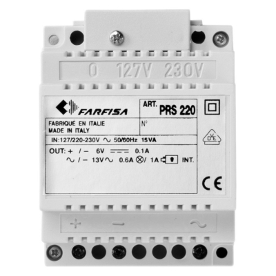 Power supply for 4+1 intercom systems with alternate current call. 15 VA. VDE and SASO certification. 4 A modules in DIN bar.