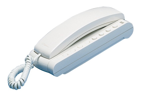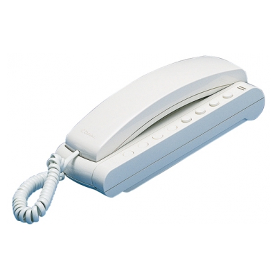 White RAL 9010 telephone with electronic call, door opener pushbutton and supplementary pushbutton for additional services. Addition of pushbuttons, switches or supplementary