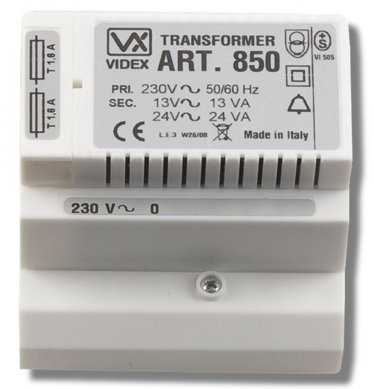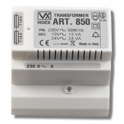 Transformer 230 Vac input, 13Vac 13VA and 24Vac 24VA outputs. It can supply up to two videophones in parallel.  In a standard 5 modules A type DIN box (87.50mm)