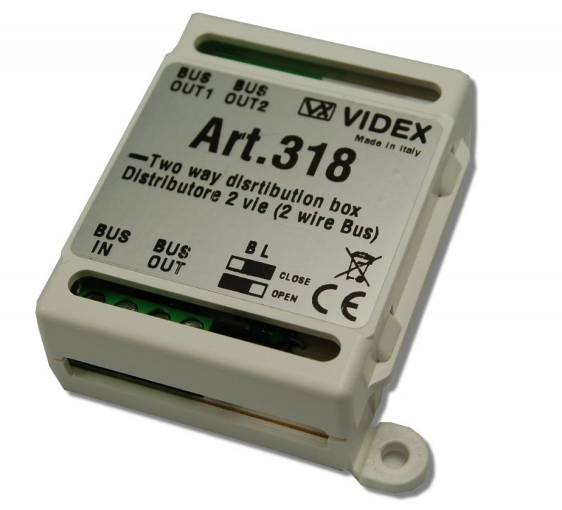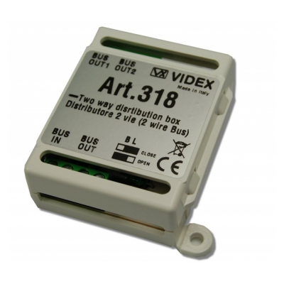 2 ways passive line bus distributor for VX2300 system, it can be used in smaller systems where the distance between the outdoor station and the furthest monitor is not over 70 mt. It is housed in a 50x60x20 mm plastic box which is for surface mounting.