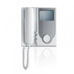 White Wall-mounted monitor for Sound System with 3.5 in black and white screen, coaxial cable connection, fixing bracket with terminal block, loudspeaker for electronic calls and three buttons (door opening, auto-activation and stair light), call volume adjustment to one of 3 levels and call exclusion with red LED indication, green LED indicating open door