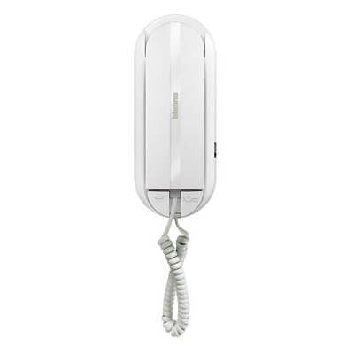 2 wires audio handset (without the possibility of fitting with accessories) for audio systems and mixed audio /video systems. Wall mounted installation without the need of accessories. With door lock release key and auxiliary functions key (that can be configured). Ringtone volume adjustable on 3 levels. White finish