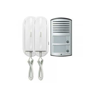 This Bticino audio kit includes the stylish Linea two button panel and two Sprint L2 audio handsets which has clearly labelled icons. This kit is ideally suitable for a small flat or office building.