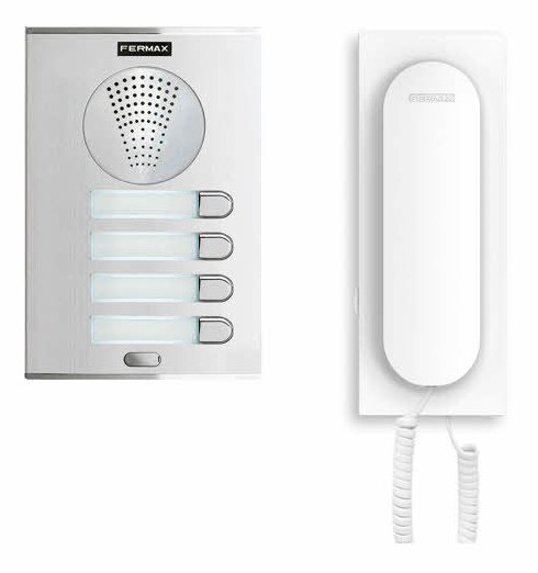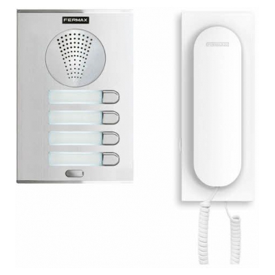 This high quality complete four way audio door entry kit by Fermax includes four of the popular white Loft handsets and a four button silver City Line door entry panel.