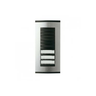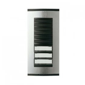 This audio entry panel is suitable for a small block of flats with one main entrance. It comes with three LED illuminated call buttons. Each button is integrated with a name window to hold an easily replaceable name card.