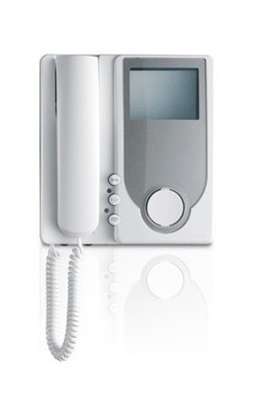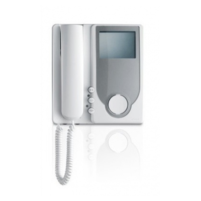 Wall-mounted monitor for Digibus system with 3.5 in colour screen, with microcontroller for 4- or 8-digit encoding/decoding, three buttons for door opening, porter switchboard call and auxiliary functions, complete with fixing bracket with terminal block