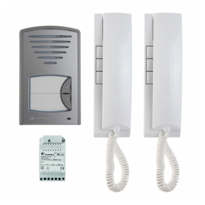 Two-way audio kit, 1+1 reduced wiring technology. It's of ClicKit series and it's composed by 2 EX311 Exhito intercoms + 1 anodised aluminium Click series flush mounted push button panel with 2 buttons + 1 PRS210 power supply. Distributed in carton box.