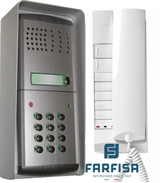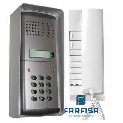 This door entry kit is part of Farfisa’s Reduced Wiring range and is comprised of a one-button Profilo module + keypad together with an Exhito audio handset.