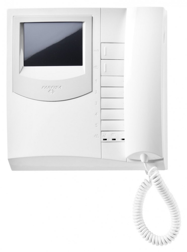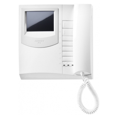 Colour videointercom Exhito series with 4" LCD screen and with 7 buttons (auto switch-on, electric door lock and further 5 for auxilliary services that can be intercommunicating calls) with electronic call technology. The monitor is white and outside the screen it is grey. It can be installed even in systems with conventional wiring or reduced cabling, or digital FN4000/DF6000 systems according to the wall bracket used.
