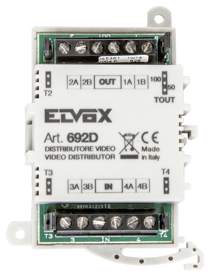 Passive floor distributor for adapting video signal impedance on balanced connection lines, installation on DIN rail (60715 TH35), occupies 1 module size 17.5 mm