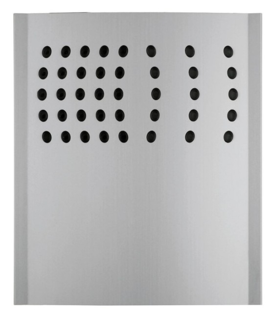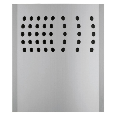 Element of Profilo modular external door station where the door speaker is integrated. Without call button, for 4+1 intercom systems with alternate or electronic current call. It is installed on the wall, with built-in box, rain shelter or hood cover. The front plate is made by aluminium.