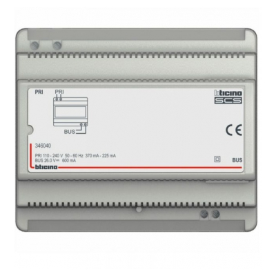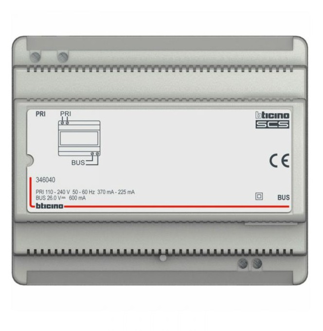 A power supply for Bticino's 2-wire audio system in a 6 DIN modular housing. Power supply 110-240v AC 50-60 Hz. The output it supplies 26v DC, rated low voltage and a maximum rated current of 600mA.