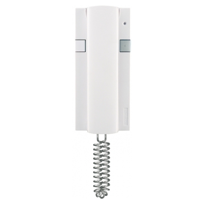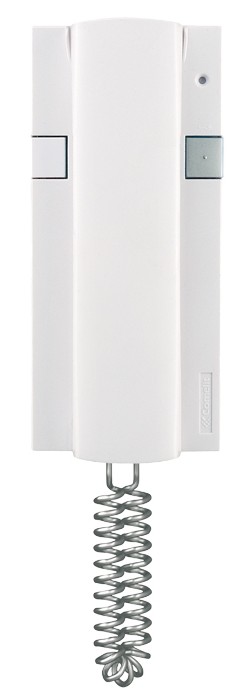 Universal door-entry phone, compatible with most of the door-entry phones produced by leading international manufacturers. Ideal in door-entry phone system replacements and repairs. Speech button on base unit, call volume adjustment and privacy function. Features a lock-release button and an extra button for additional services with independent common. Features loudspeaker volume control and microphone volume control to meet all possible requirements, can be used for systems with positive common or systems with negative common, can replace door-entry phones with condenser microphone and carbon capsule, features electronic calling or mechanical calling by means of a buzzer. Supplementary buttons or LEDs cannot be added for this model.