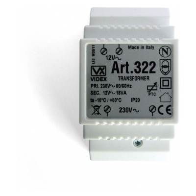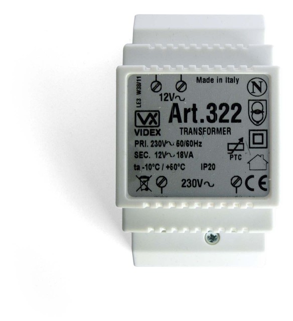 Transformer 230 Vac 1.3A output. with internal PTC protection; 18VA max. In a standard 3 modules A type DIN box (52.5mm). For installation with outdoor station composed of 2 modules max.