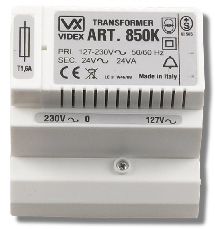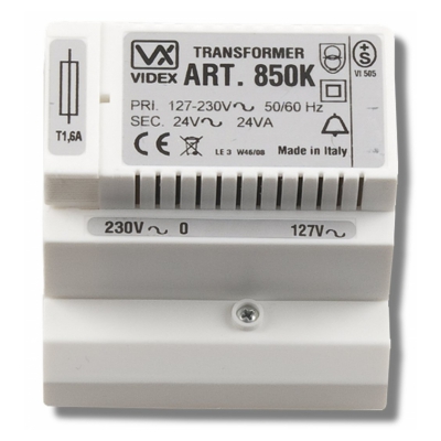 Transformer 230-127 Vac inputs, 24Vac 24VA output. Used for videokits. In a standard 5 modules A type DIN box (87.50mm)