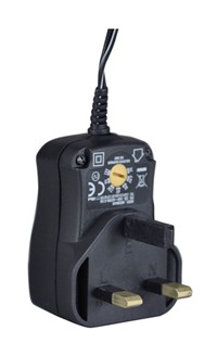 Plug-in regulated power supply with 3-12 V DC switchable output. LED indicator and selectable polarity. Comes complete with 6 DC adaptor plugs. Features include, IC regulated DC output, short circuit protection and automatic overload cut off.