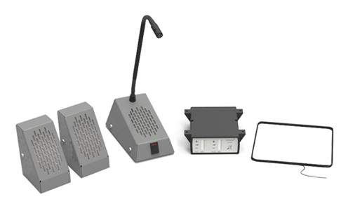 This speech transfer system features individual speaker and microphone units for the customer-side. This system also includes our open duplex amplifier, a hearing loop, and a free-standing staff microphone and speaker unit. It is suitable for quiet environments with lower ambient noise.