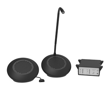 Speaker and Microphone Pod System. This entry level speech transfer system provides high quality sound across partitions and safety screens, featuring speaker and microphone pods which can be either free standing or surface mounted. Open duplex amplifier and mouse microphone are included. It is an affordable system suitable for environments with low - mid level background noise .